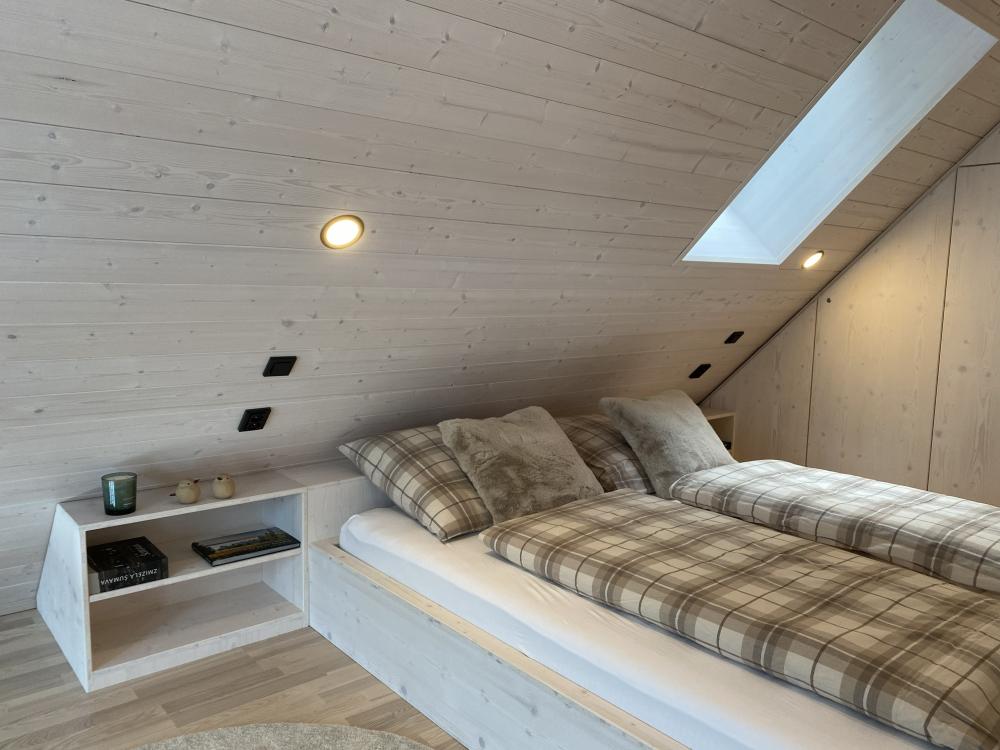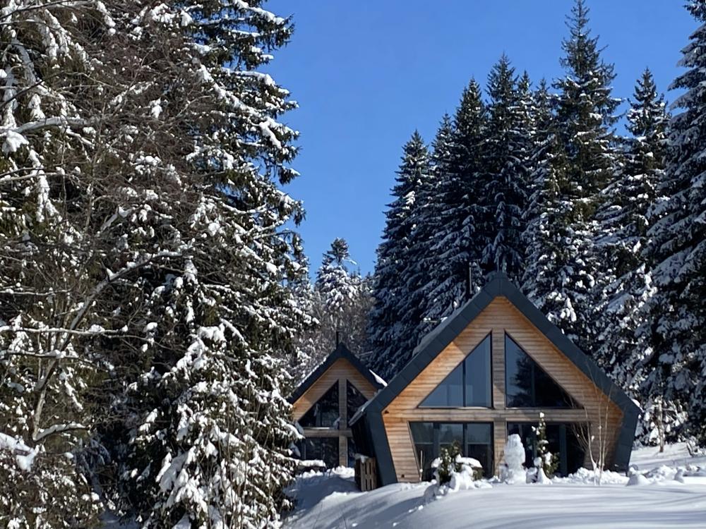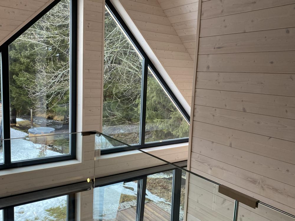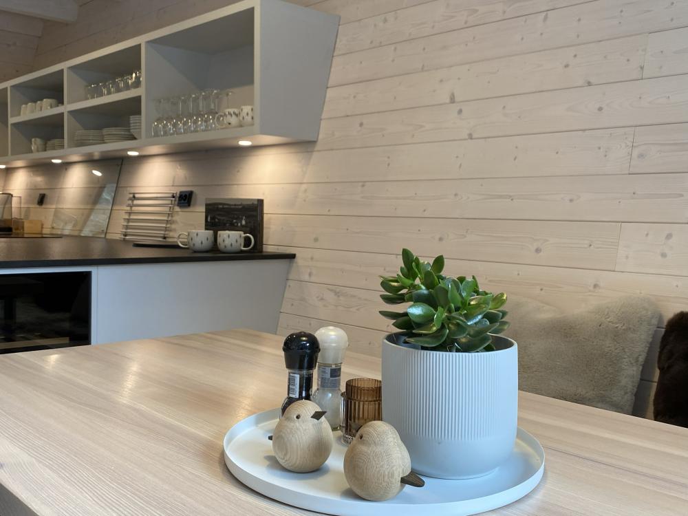 Stylová chata o celkové podlahové ploše 80 m² nabízí komfortní zázemí pro vaši dovolenou v přírodě. Dominantou interiéru je prostorný obývací prostor propojený s moderní kuchyní, která je plně vybavena nádobím i kvalitními spotřebiči – myčka nádobí, indukční varná deska, trouba, lednice s mrazákem, vinotéka, kávovar Nespresso a rychlovarná konvice jsou samozřejmostí. Součástí obývací části je také rozkládací pohovka a TV, ideální pro večerní odpočinek.