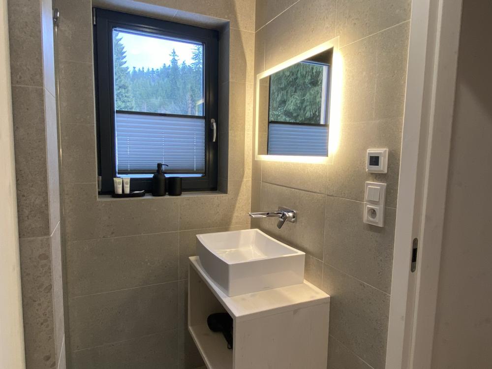 V přízemí se nachází koupelna se sprchovým koutem, samostatné WC a praktické zádveří s úložným prostorem. Horní patro nabízí klidovou zónu rozdělenou na dvě části – ložnici s manželskou postelí a vestavěnými úložnými prostory a druhý prostor s komfortním dvojlůžkem, které zajišťují maximální pohodlí i soukromí. Součástí chaty je také prostorná venkovní terasa s grilem, ideální pro ranní kávu, večerní posezení i relaxaci s výhledem do okolní zeleně.